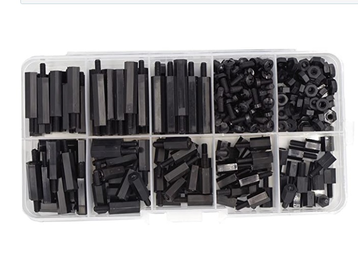 Amazon description: HVAZI 320pcs M2.5 Nylon Hex Spacer Standoffs Screws Nuts Assortment Kit; Male-Female(Black) $13. for this kit