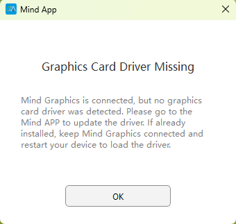 The full message reads: ‘Mind Graphics is connected, but no graphics card driver was detected. Please go to the Mind APP to update the driver. If already installed, keep Mind Graphics connected and restart your device to load the driver.’