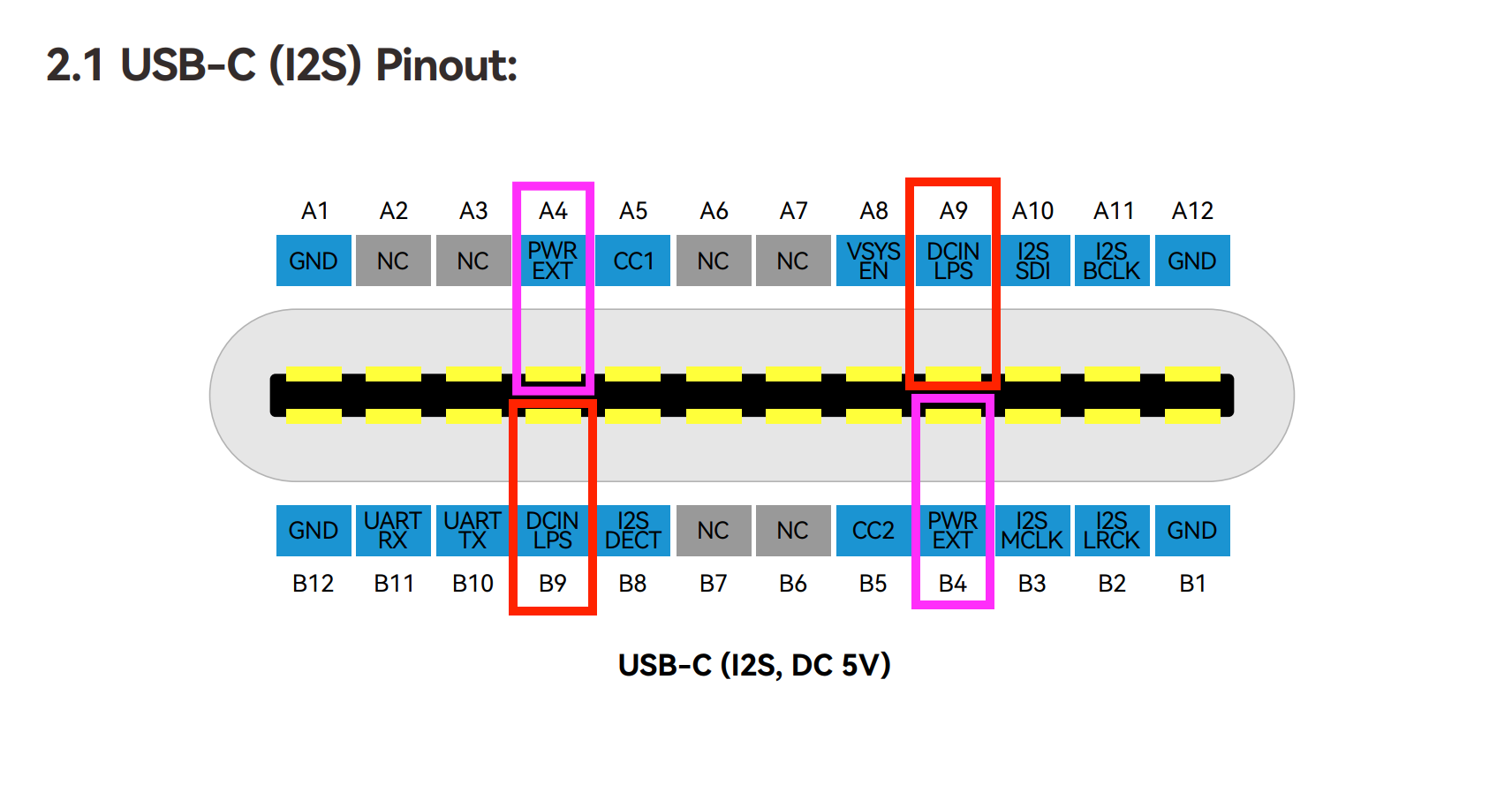USB-C(I2S): A4 and B4 could output DC5V, A9 and B9 could Input DC5V at the same time.