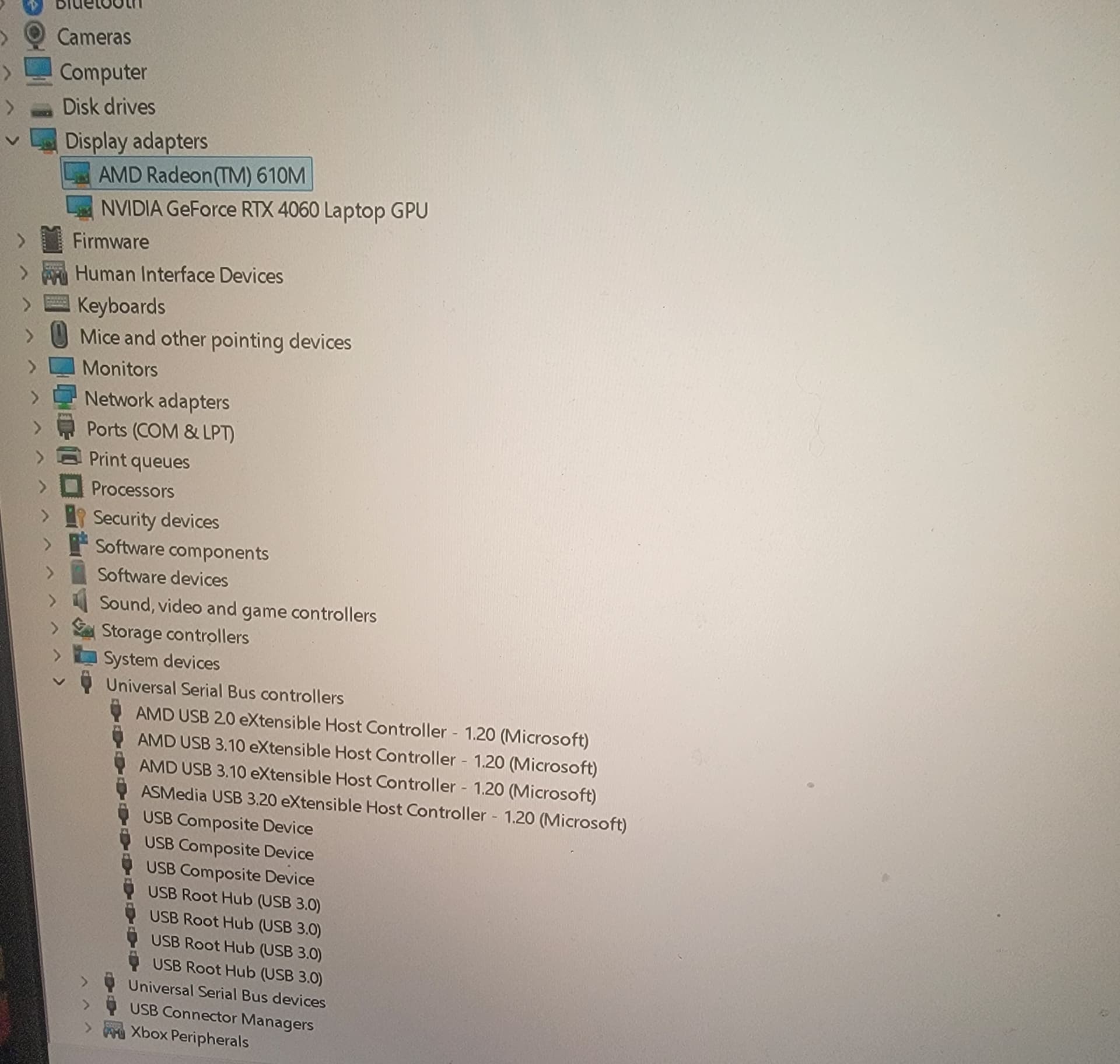 Hello, would you mind opening Device Manager to check the Universal Serial Bus controllers and display adapters, then provide a screenshot? This would be very helpful for us in analyzing the issue.