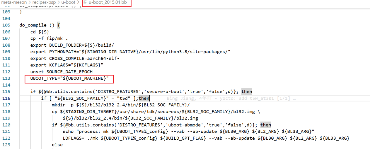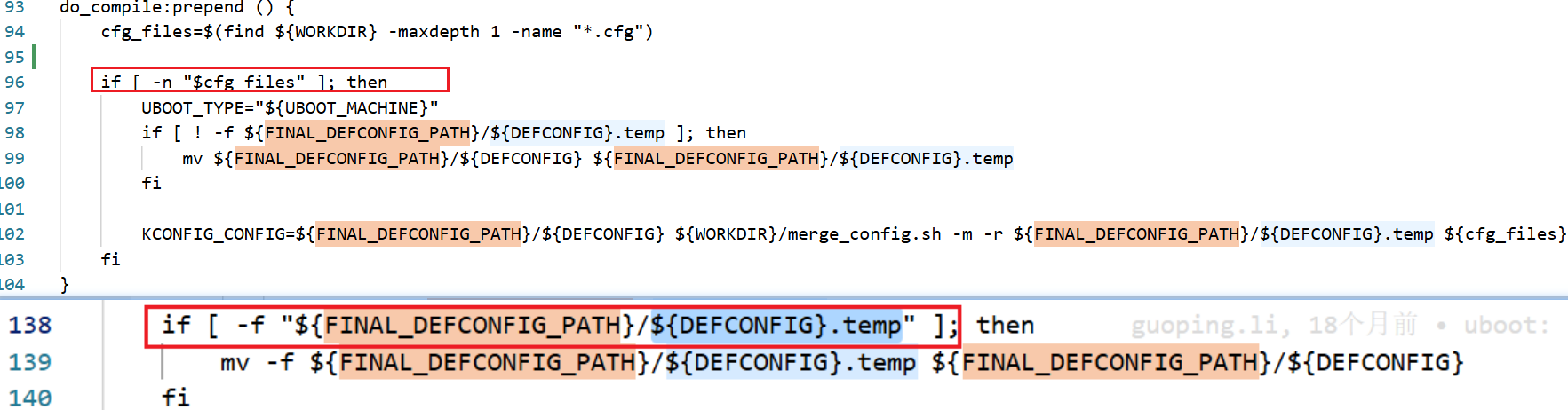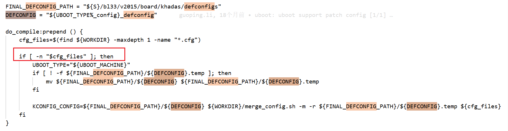 do_compiletask, after UBOOT_TYPEis assigned a value (line 114), using bbnoteto print and verify confirms that the variable contains a value. The figure below shows my print result:DEFCONFIGis merely variable initialization; even if defined before UBOOT_TYPE, it does not matter. After UBOOT_TYPEis assigned a value (line 114 or line 97), DEFCONFIGwill likewise contain a valid value. You can verify this by adding a bbnoteprint statement after line 114 to observe the result.do_compile:prepend function, both UBOOT_TYPE and DEFCONFIG are indeed empty. This is due to the cfg_files variable being empty, as shown in the figure below.FINAL_DEFCONFIG_PATH variable indeed needs to be modified to ${S}/bl33/v2015/board/khadas/defconfigs . However, since no cfg files exist and there is no ${DEFCONFIG}.temp file, even an incorrect directory assignment here does not affect functionality.@Naruto-China ,OK, I need to modify these elements because I enabled absystem feature, and there’s a cfg file that needs to be merged.