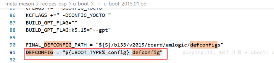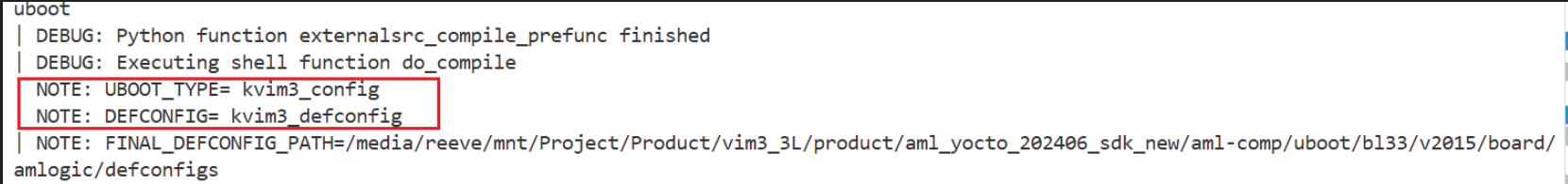 At this point, DEFCONFIG = kvim3_defconfig , which corresponds exactly to the kvim3_defconfig file located in the ${S}/bl33/v2015/board/khadas/defconfigs directory.UBOOT_TYPE and DEFCONFIG variables being empty, I am not clear about the specific location where your bbnote is being printed.UBOOT_TYPE variable is located in the meta-meson/recipes-bsp/u-boot/u-boot-2015.01.bb file. After UBOOT_TYPE is assigned a value, the DEFCONFIG variable will also be assigned a value through string concatenation.Hello @Naruto-China, thank you very much for your detailed reply. I understand the points you explained.