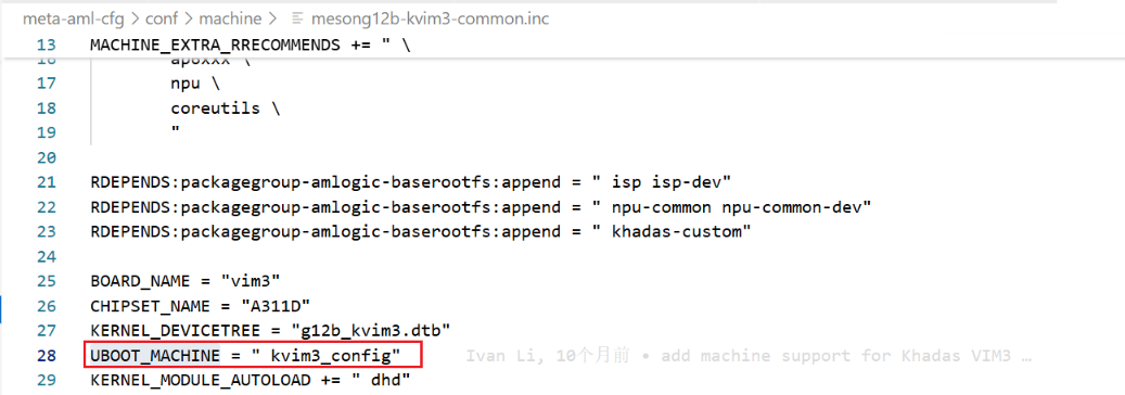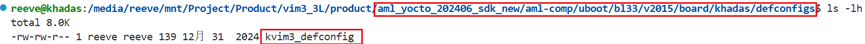 FINAL_DEFCONFIG_PATH variable points to${S}/bl33/v2015/board/khadas/defconfigs. As shown in the figure below, the directory contains the kvim3_defconfig file, which is the configuration file for U-Boot.meta-aml-cfg/conf/machine/mesong12b-kvim3-common.inc, the kvim3_config variable is assigned to UBOOT_MACHINE.meta-meson/recipes-bsp/u-boot/u-boot_2015.01.bb, the UBOOT_MACHINE variable is used to assign a value to UBOOT_TYPE, where UBOOT_TYPE = kvim3_config.kvim3_config not being located in the${S}/bl33/v2015/board/khadas/defconfigs directory, please refer to the figure below. The following details can be observed in the meta-meson/recipes-bsp/u-boot/u-boot_2015.01.bbfile.${UBOOT_TYPE%_config}_defconfig performs the following operations: