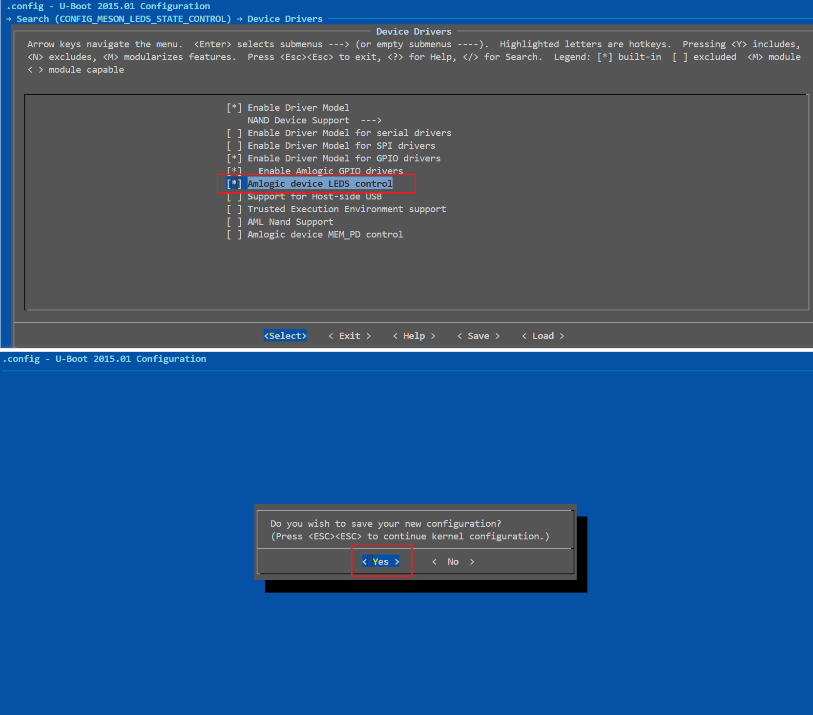 kvim3_defconfig file in the directory ${S}/bl33/v2015/board/khadas/defconfigs/ is the u-boot config for the VIM3 board.${S}/bl33/v2015 directory and execute make menuconfig to launch the config menu.CONFIG_MESON_LEDS_STATE_CONTROL , select the option "Amlogic device LEDS control" as shown in the figure below, then exit and save the configuration.${S}/bl33/v2015 directory and execute make savedefconfig to save the configuration changes into the defconfig file.${S}/bl33/v2015/build/ directory and copy the contents of the generated defconfig file to kvim3_defconfig . This action updates the U-Boot configuration for the target board.kvim3_defconfig file is shown in the figure below.Hi @Naruto-China @numbqq , could you please confirm whether the NPU is fully supported in the Yocto SDK? I was able to find /dev/galcore in Yocto, but our application, which uses the NPU and works well on fenix Ubuntu 20.04/22.04, does not function correctly in Yocto.